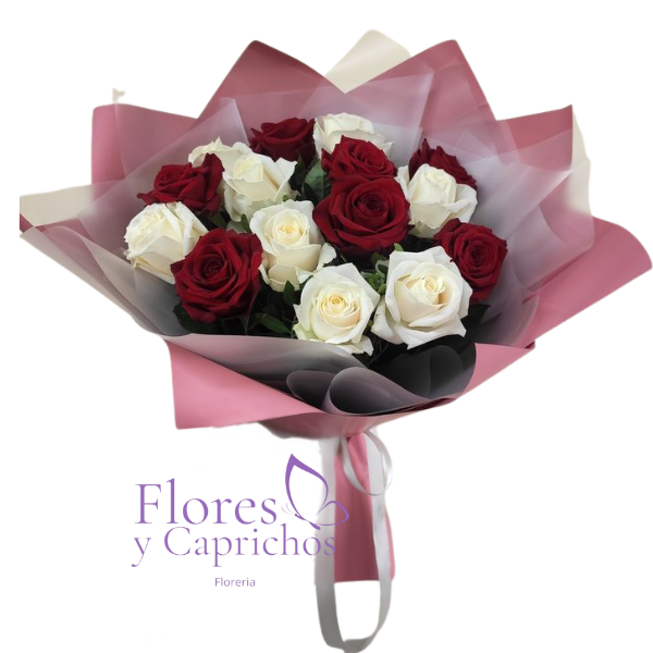 Lindo ramo con 12 rosas bicolor en fina envoltura de papel coreano y lazo con cinta satinada.