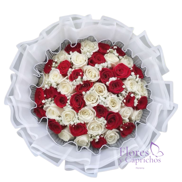 Lindo ramo con 40 rosas bicolor y toques de ilusión mas fina envoltura de papel coreano y lazo con cinta satinada.