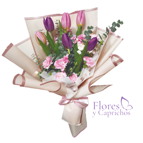 Lindo ramo con 6 tulipanes bicolor, eucalipto en extendida envoltura de papel coreano y lazo con cinta de tela.