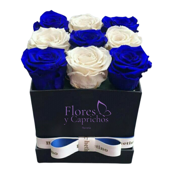 Lindo box con 9 rosas bicolor mas lazo con cinta de tela.