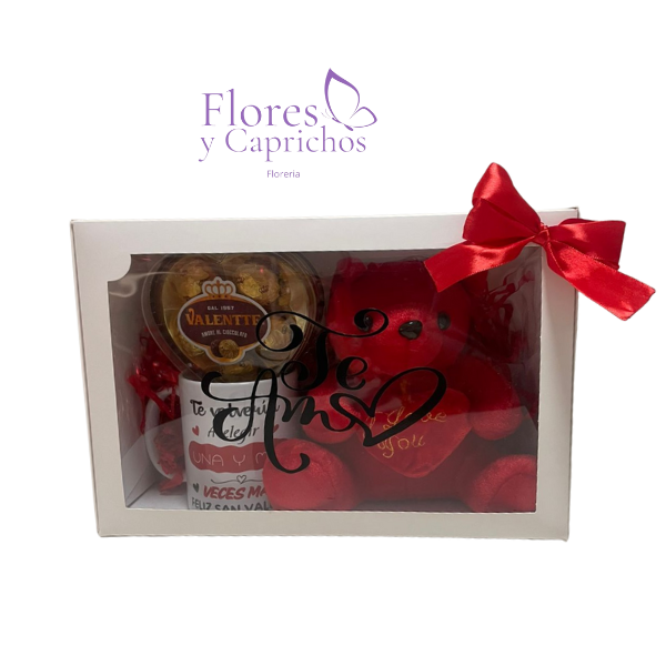 Linda caja con peluche de 20cm, bombones valente de 5 unidades en caja de corazón y taza con frases de amor, todo con lindo lazo de cinta satinada.