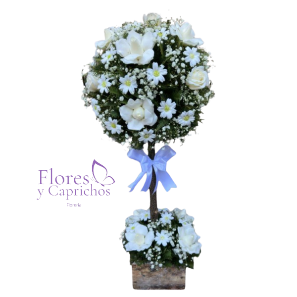 Fino arbol con flores eternas blancas y lazo con cinta satinada.