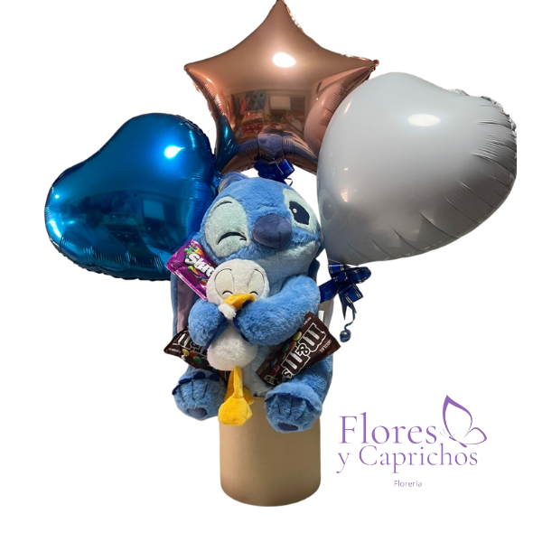 Lindo Box con 3 globos, peluche de Stitch, 2 chocolates MyM y Skittles.