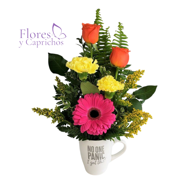 Fino arreglo floral en taza que contiene 2 rosas naranjas importadas, verde de temporada, gerbera fucsia y 2 claveles amarillos