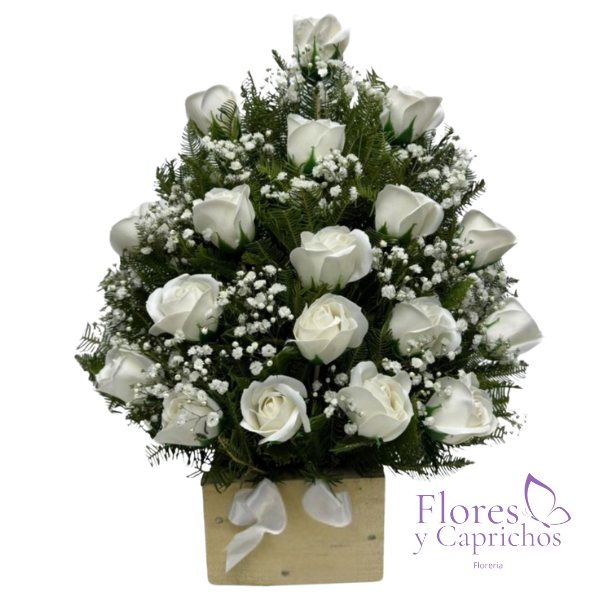 Lindo arrimo en base de madera con 20 rosas eternas de jabon , ilusión y verde de temporada.