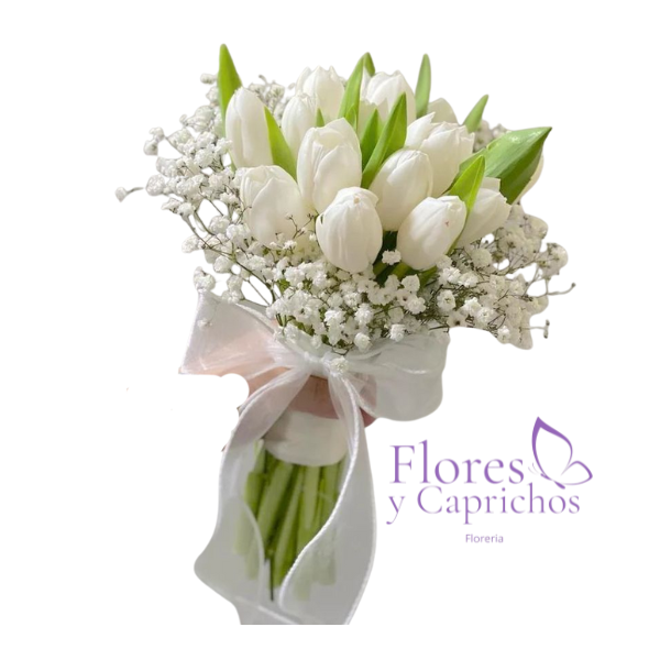 Lindo bouquet de novia con 10 tulipanes blancos y ilusion al rededor con tallos envueltos en cinta satinada junto a lindo lazo.