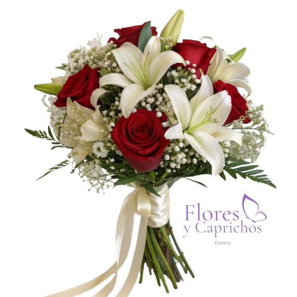 Lindo Bouquet de novia con 6 rosas rojas importadas mas lirios blancos , ilusión y verde de temporada, con tallos envueltos en cinta satinada.