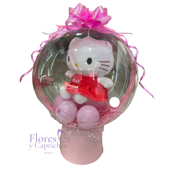 Lindo box con globo burbuja que dentro incluye lindo peluche de Hello Kitty con rosetón.