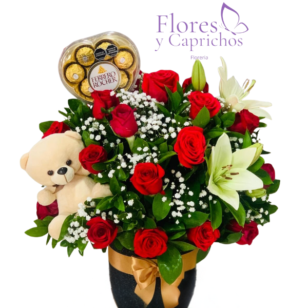 Lindo box con 20 rosas rojas mas ilusión, lirios blancos y verde de temporada, todo con peluche de 20 cm u chocolates  ferrero rocher en caja acrílica de corazón todo con fino lazo de cinta satinada.