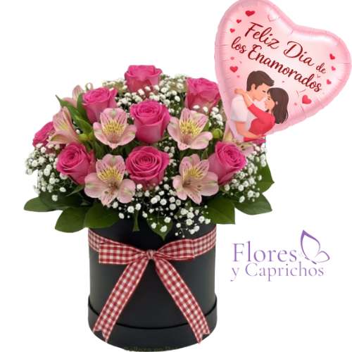 Lindo box primaveral con 10 rosas rosadas importadas mas astromelias y ilusión con lazo de cinta satinada, mas globo grande (elegir temática al momento de comprar)