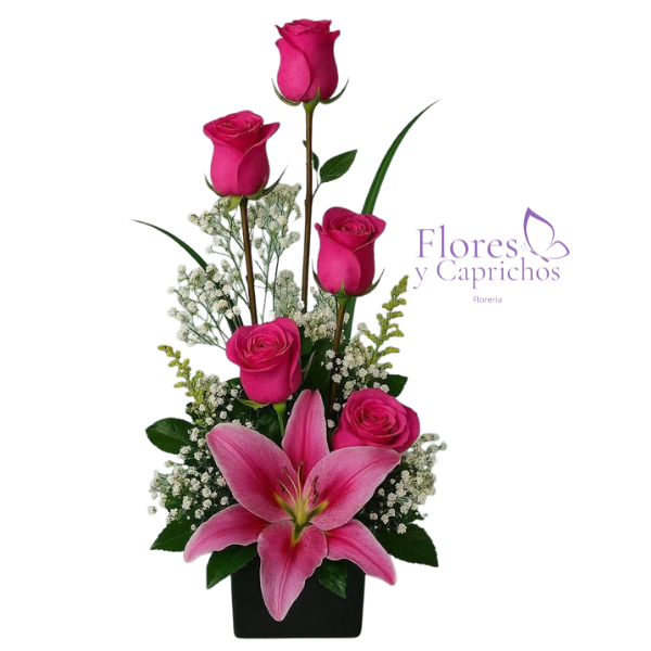 Lindo box con 4 rosas rosadas importadas, ilusión y lirio en el centro, todo con lindo lazo de cinta satinada.