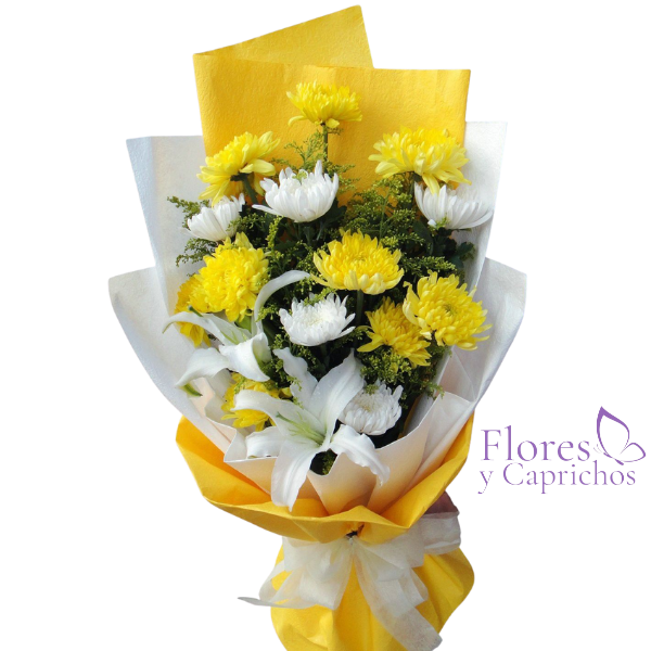 Ramo con maule amarillo y blanco mas lirios blancos en envoltura de papel coreano mas lazo con cinta de tela.