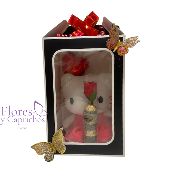 Tierna caja con peluche de Hello Kitty , bombones valente de 3 unidades con rosa eterna mas globo pequeño de corazón, todo con lindas mariposas para decoración y lazo .