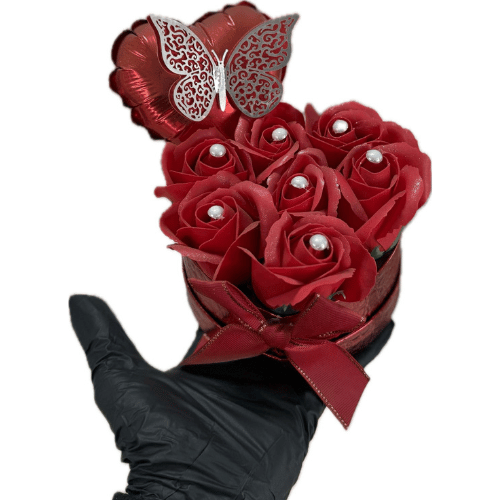 Caja Corazón Pequeña con 7 rosas Aromáticas más Globito y mariposa.