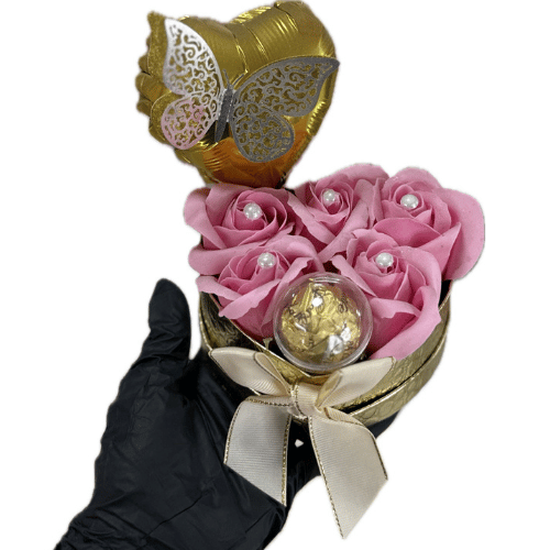 Caja Corazón Pequeña con 5 rosas Aromáticas, 1 bombón más globito y mariposa.