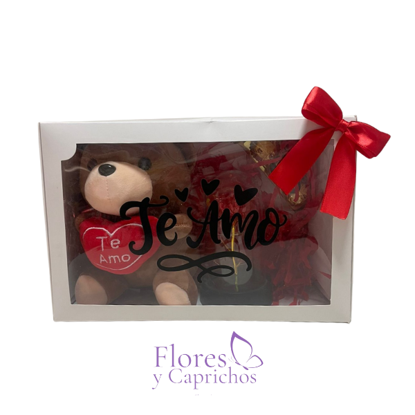 Linda caja con peluche de 20 cm, rosa eterna en cúpula con luz y bombones valente de 3 unidades, todo con lindo lazo de cinta satinada.