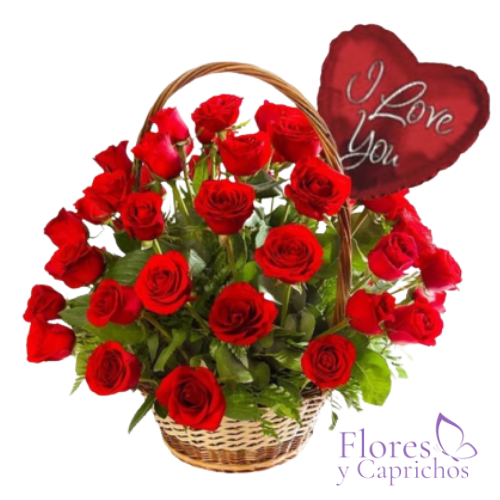 Fina canasta con 50 rosas rojas importadas y globo de te amo.