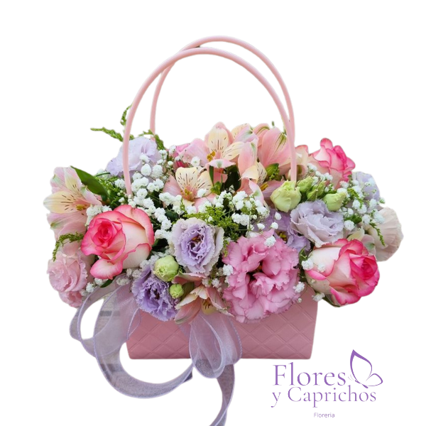 Linda cartera con mix de flores en tonos pasteles mas lazo con cinta de tela.