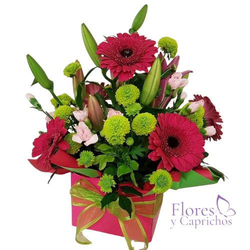 Linda cartera con 4 gerberas fucsias, verde de temporada y lirios con lazo de cinta de tela.