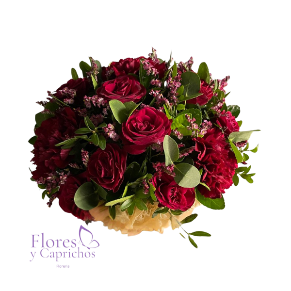 Lindo centro de mesa con 10 rosas rojas importadas y verde de temporada, todo en rustica base de madera.