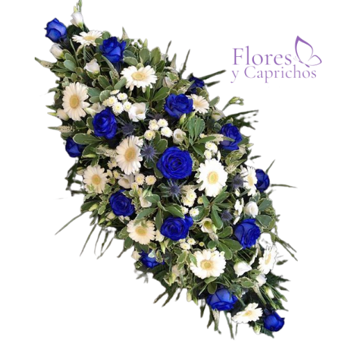 Lindo cojín premium con rosas azules, gerberas blancas, verde y follaje de temporada.
