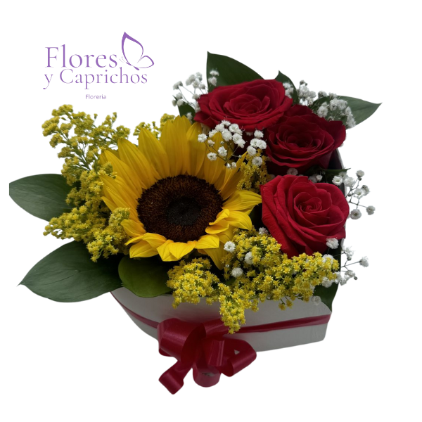 Lido box corazón con girasol y 3 rosas rojas mas follaje de temporada y lazo con cinta de tela