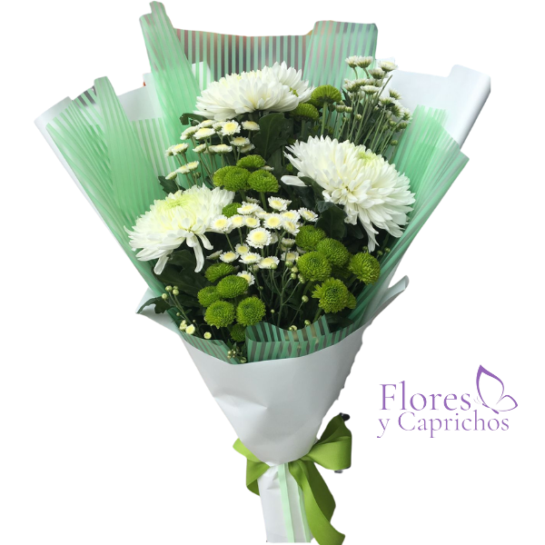 Fino ramo con cremones blancos y maule con envoltura de papel coreano mas lazo con cinta de tela.
