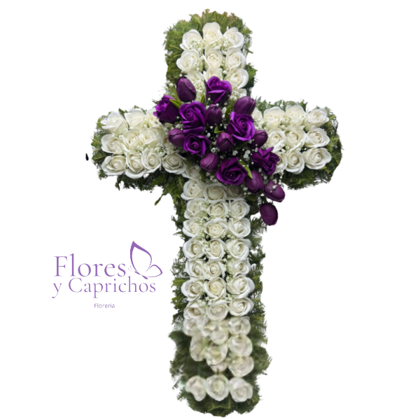 Cruz Fúnebre de Rosas Eternas Blancas y Moradas en el centro