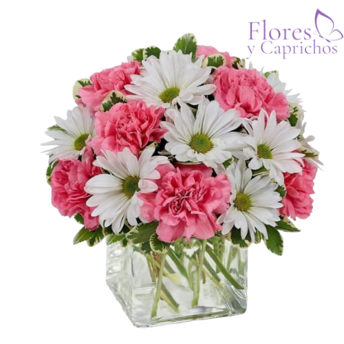 Fino cubo con margaritas blancas y claveles rosados mas verde de temporada.
