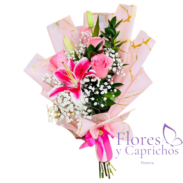Lindo ramo con 3 rosas rosadas,ilusión y lirios con fina envoltura de papel coreano y lazo con cinta satinada.