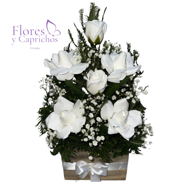detalle en base de madera con 6 rosas blancas eternas de jabón, verde y ilusión.
