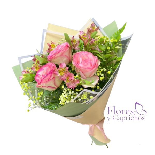 Lindo ramo con 3 rosas y follaje de temporada mas envoltura de papel coreano y lazo con cinta de tela.