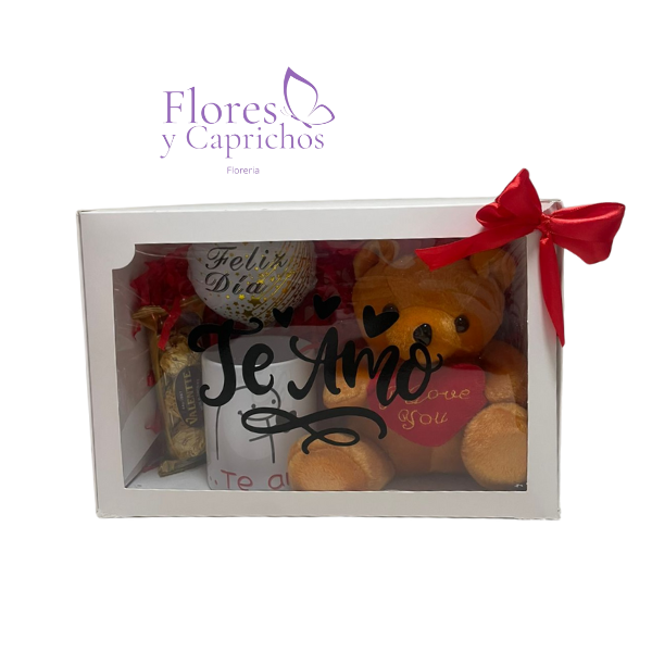 Linda caja que incluye peluche de 20cm, Taza de amor, globito de feliz dia y chocolates valente de 3 unidades, todo con lindo lazo de cinta satinada.