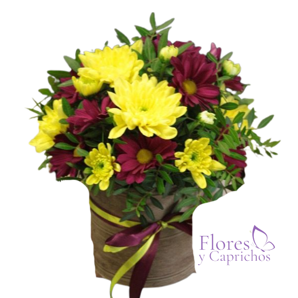 Lindo box con maule amarillo y margaritas rojas mas verde de temporada y lazo .