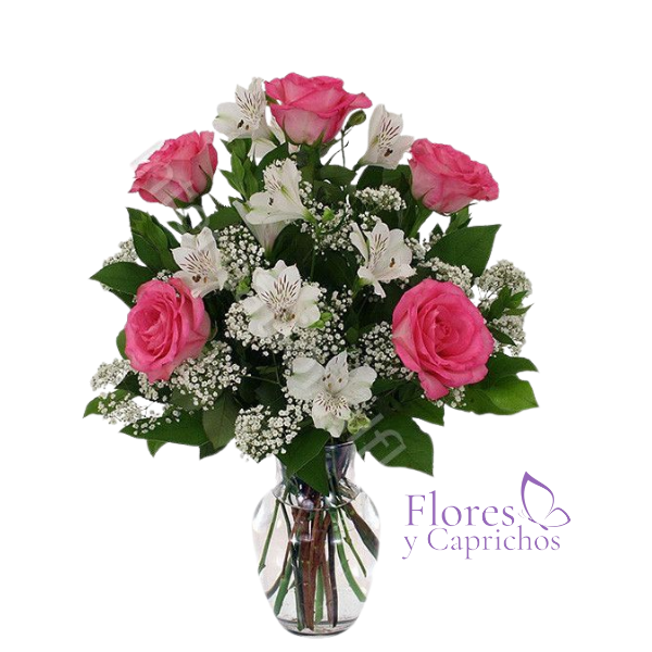 Lindo florero con 5 rosas rosadas y astromelias blancas mas verde de temporada.