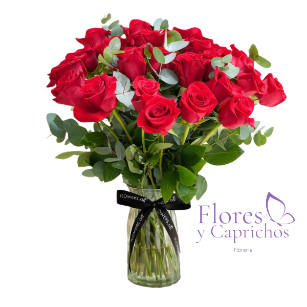 Lindo florero de 20 rosas rojas mas eucalipto con lindo lazo de cinta satinada.