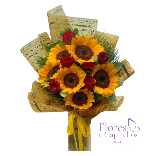 Lindo ramo con 6 girasoles y 6 rosas rojas importadas con extendida envoltura de papel coreano mas lazo con cinta de tela.