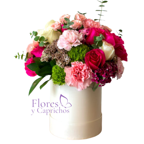 Fino box con 12 rosas bicolor, claveles, maule y eucalipto.