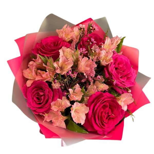 Lindo mix de flores en ramo con 5 rosas fucsias mas astromelias y follaje de temporada, todo con fina envoltura de papel coreano.