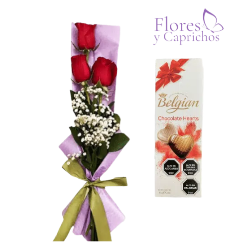 Lindo ramo con 3 rosas y ilusion mas chocolate belgian