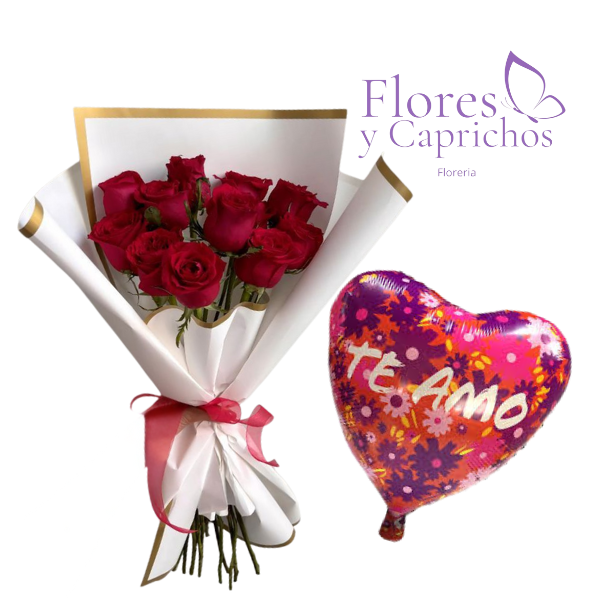 Pack que incluye 10 rosas rojas importadas con fina envoltura de papel coreano y lazo con cinta de tela, mas globo grande metálico (Temática elegida por remitente)