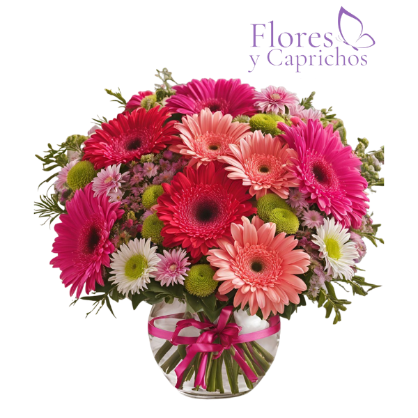 Fina pecera con 15 yerberas primaverales con distintos maules y verde de temporada, todo con lindo lazo de cinta satinada.