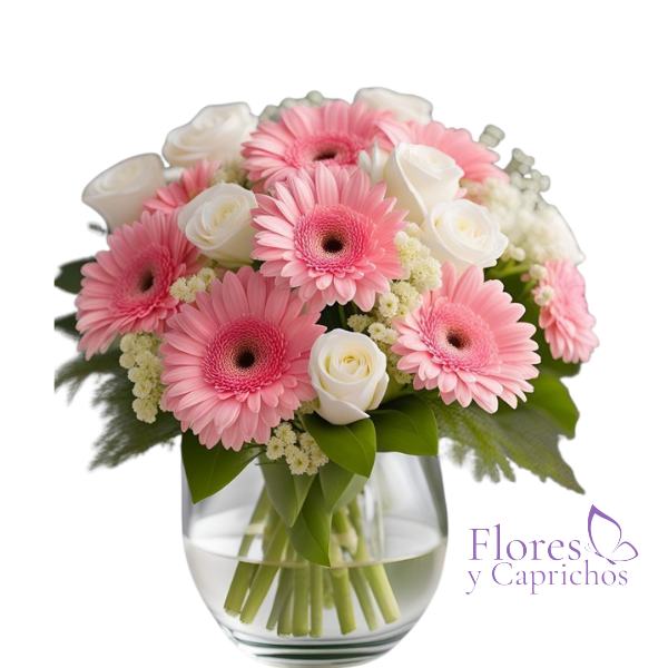 Linda pecera con 12 rosas y 10 gerberas rosadas mas ilusión.