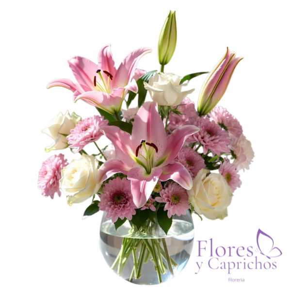 Linda pecera en lirios rosados con maule morado y lisianthus blancos.