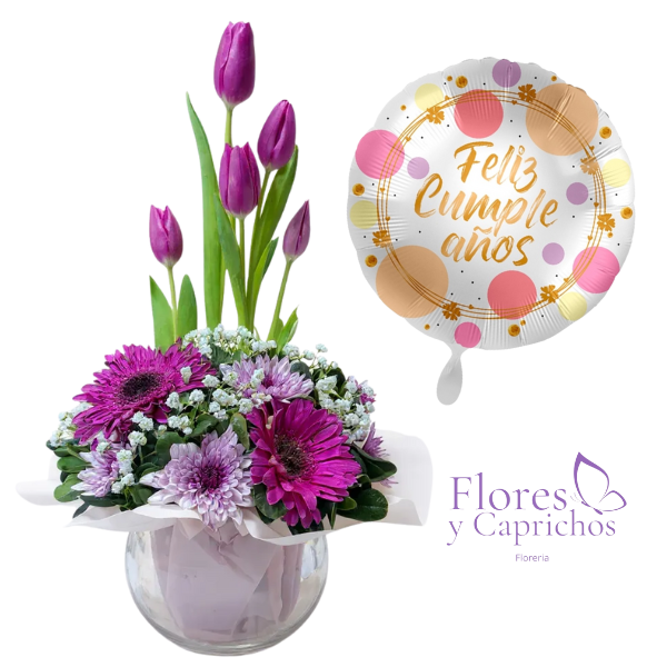 Linda pecera con maule lila, 2 gerberas moradas y 5 tulipanes lilas mas globo metalico (Elegir temática al momento de comprar).