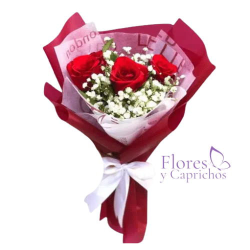 Fino ramo con 3 rosas rojas importadas y ilusión con linda envoltura y lazo