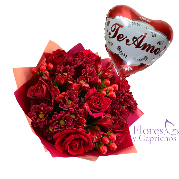 Lindo ramo con 10 rosas rojas, Maule rojo y follaje de temporada rojo, con fina envoltura en papel coreano y lazo con cinta de tela mas globo de te amo.