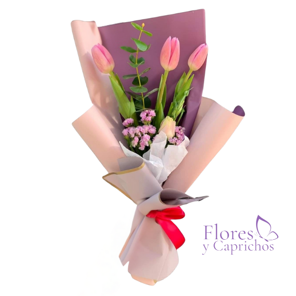 Fino ramo con 3 tulipanes rosados con follaje de temporada en fina envoltura de papel coreano mas lazo con cinta de tela
