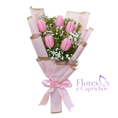 Lindo ramo con 5 tulipanes rosados y follaje de temporada con extendida envoltura de papel coreano y lazo con cinta satinada.