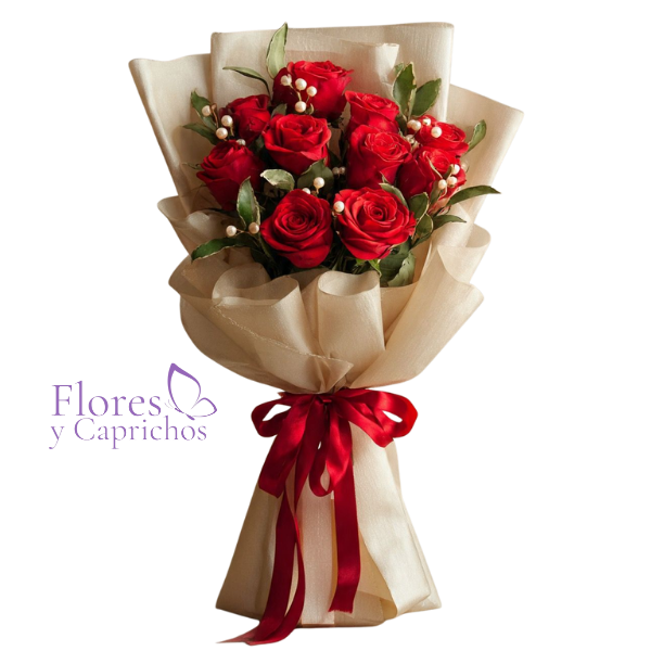 Elegante ramo con 10 rosas rojas importadas mas ilusion, en fina envoltura de papel coreano mas lazo con cinta de tela.